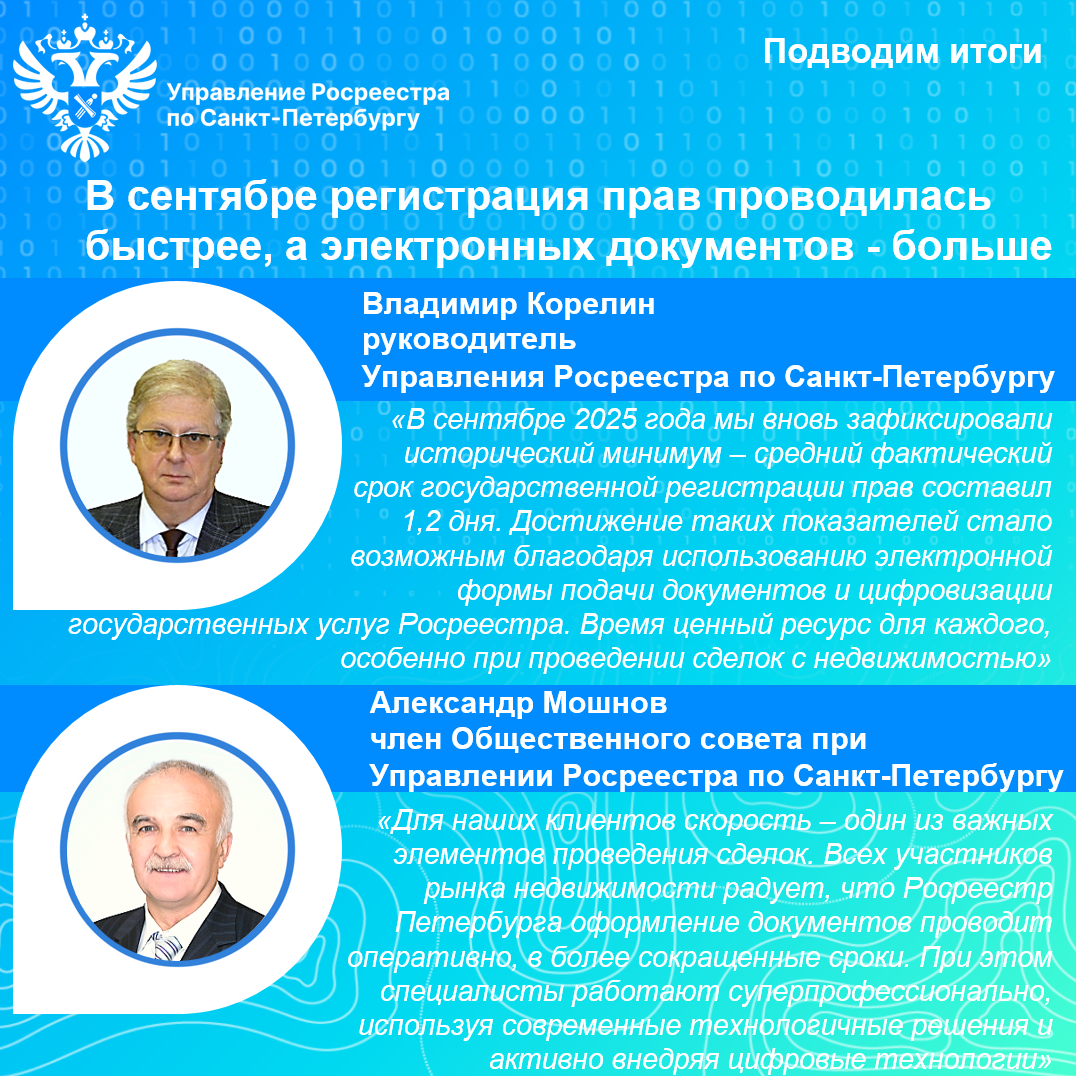 «В сентябре 2025 года мы вновь зафиксировали исторический минимум - средний фактический срок государственной регистрации прав составил 1,2 дня. Достижение таких показателей стало возможным благодаря использованию электронной формы подачи документов и цифровизации государственных услуг Росреестра. Время ценный ресурс для каждого, особенно при проведении сделок с недвижимостью»