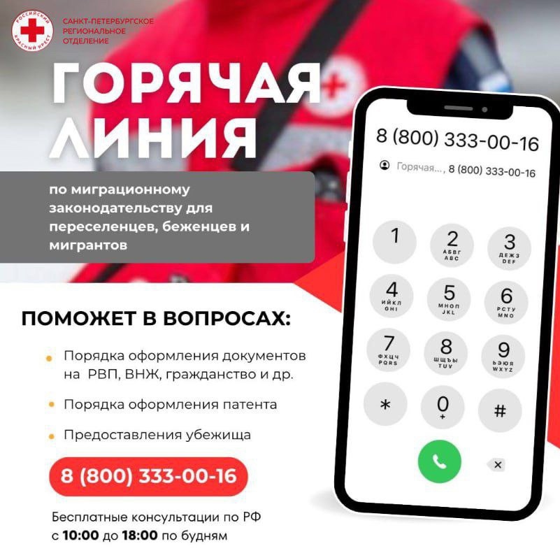 Санкт-Петербургское отделение Российского Красного Креста осуществляет бесплатную информационную и правовую помощь иностранным гражданам.